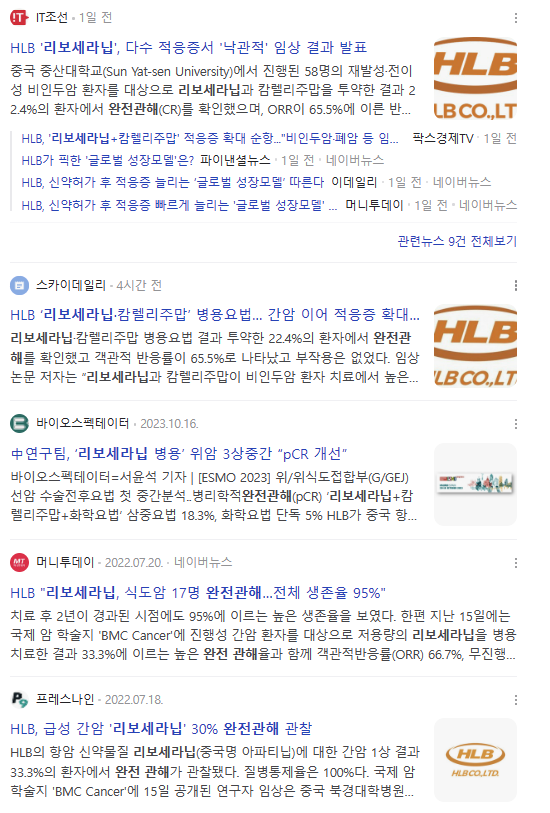 리보세라닙은 HLB의 신약 개발 자회사 Elevar의 임상 외에도 항서 제약의 임상 및 국내외 수많은 연구자들이 연구자 임상을 진행하고 있으며 매년 수많은 논문이 발표되고 있고 긍정적인 임상 결과와 완전 관해(암이 없어짐) 결과들이 수없이 많이 발표되고 있다.