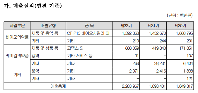 특히, 아래 셀트리온 사업보고서에서 매출실적과