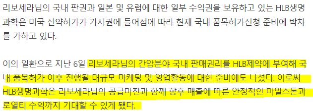 HLB에서 아시아 지역 리보세라닙 상업화를